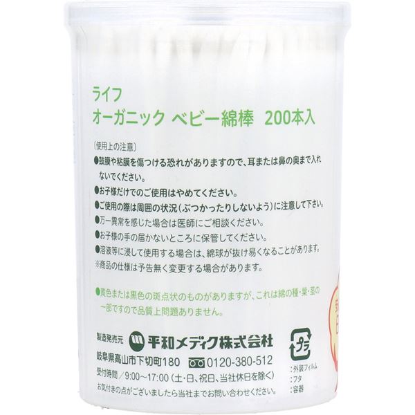 【平和メディック】ライフ 無漂白オーガニックベビー綿棒 200本入